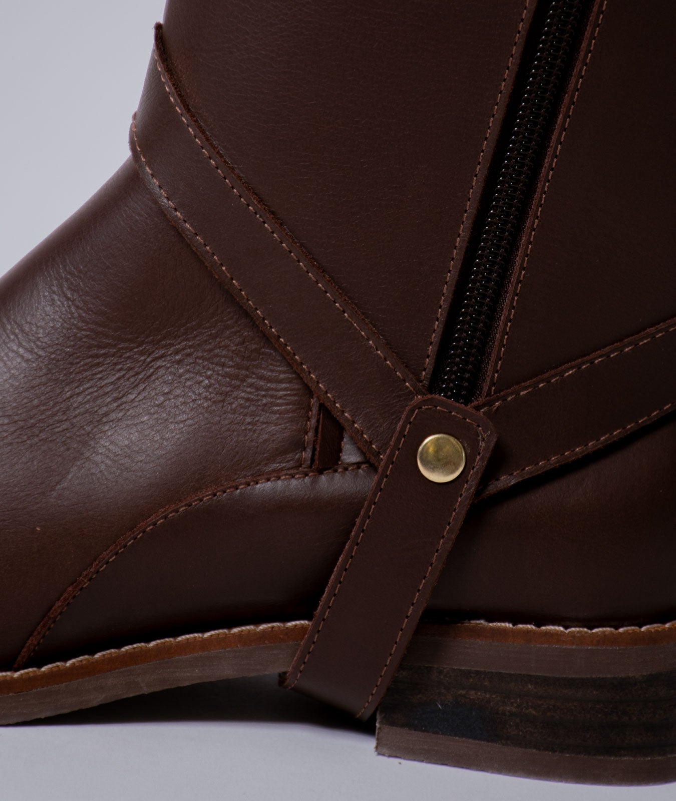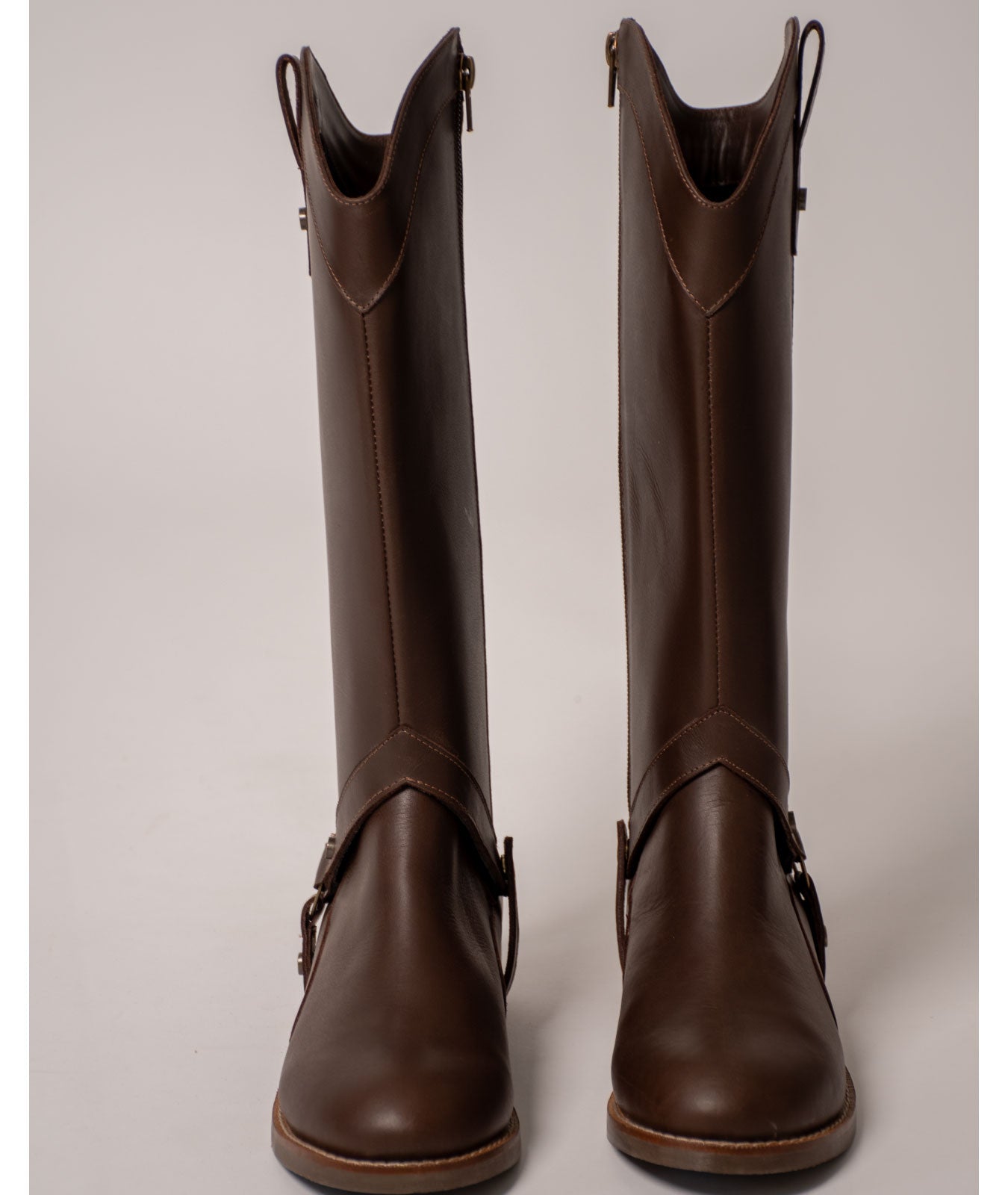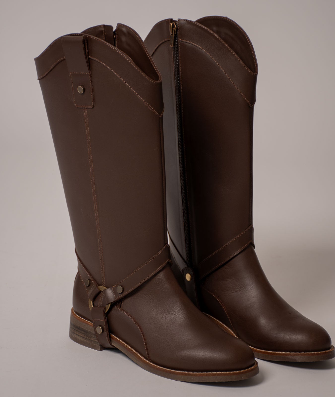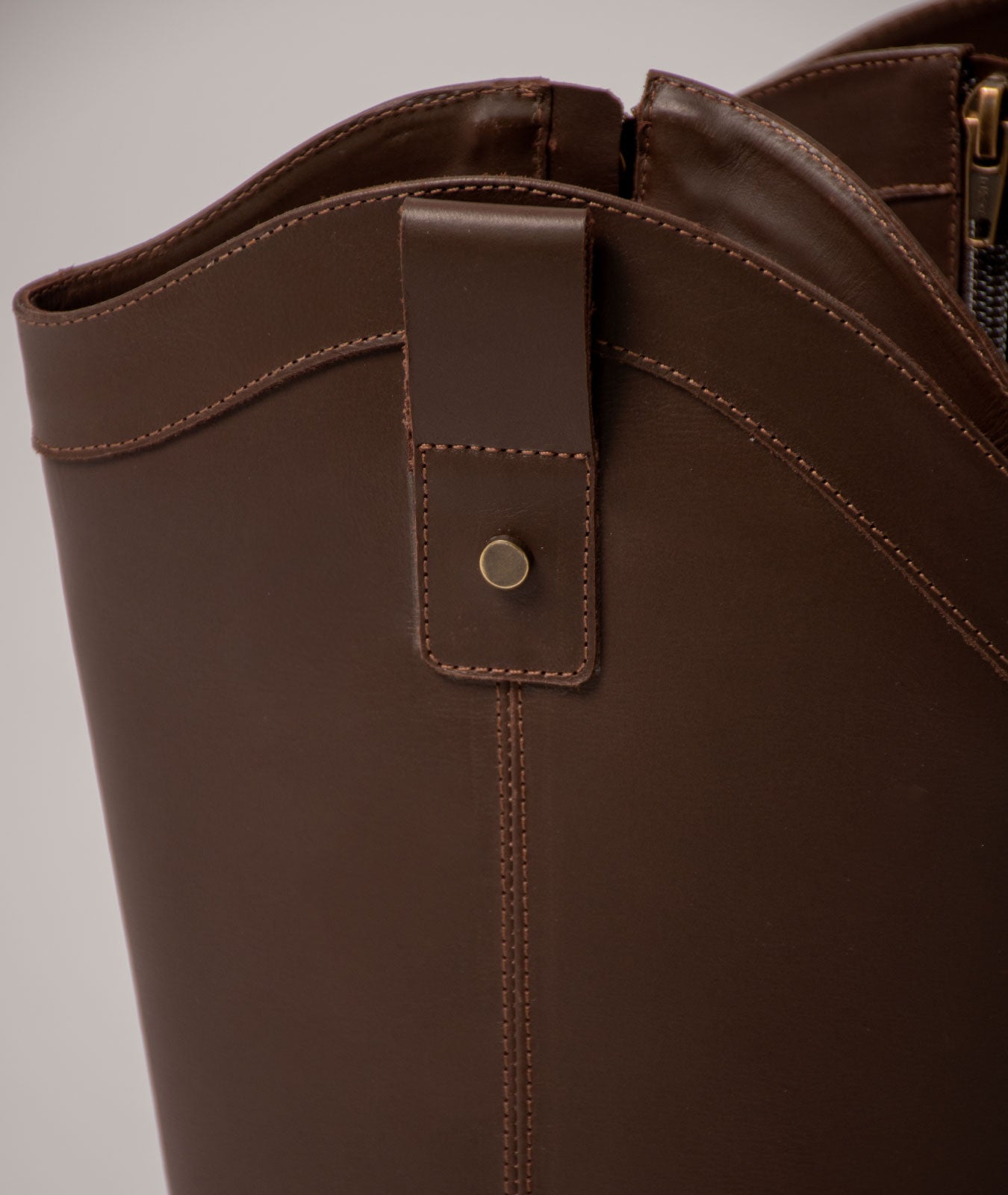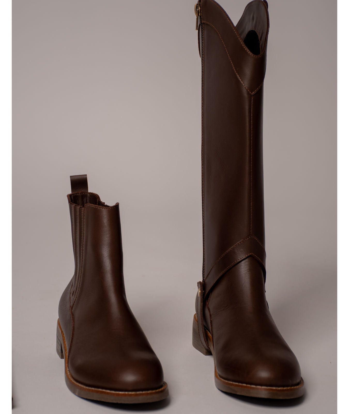 Bota convertible Vera café: cuero genuino, diseño versátil y artesanal. Úsala como caña larga o media para looks casuales y sofisticados.