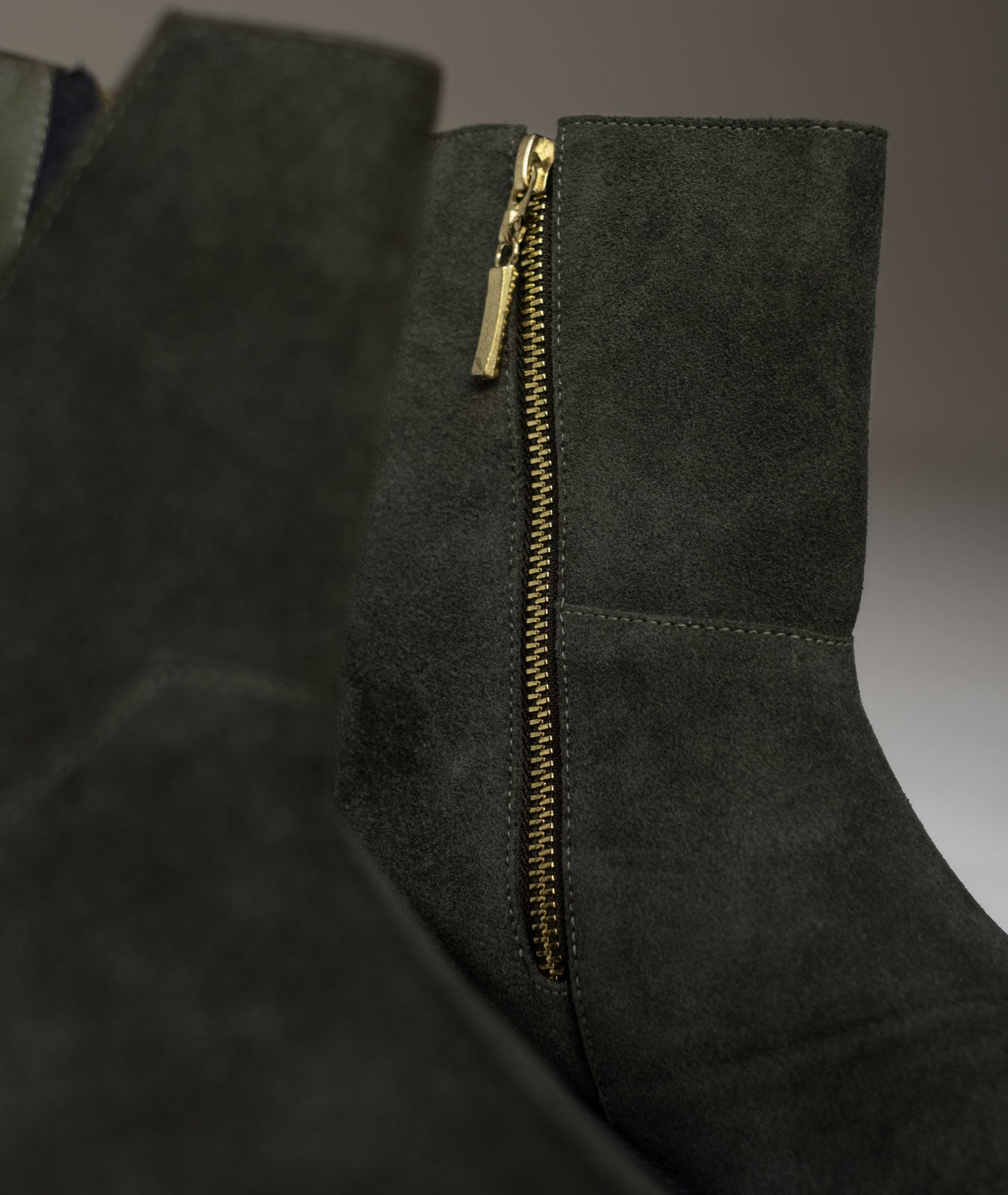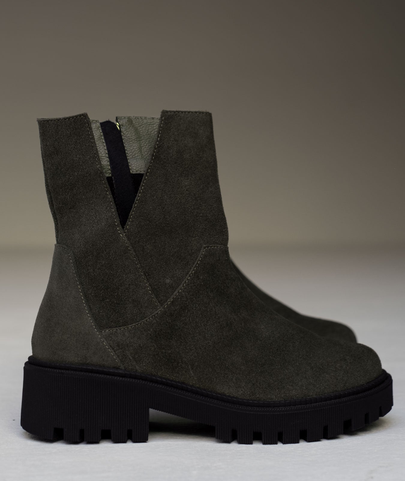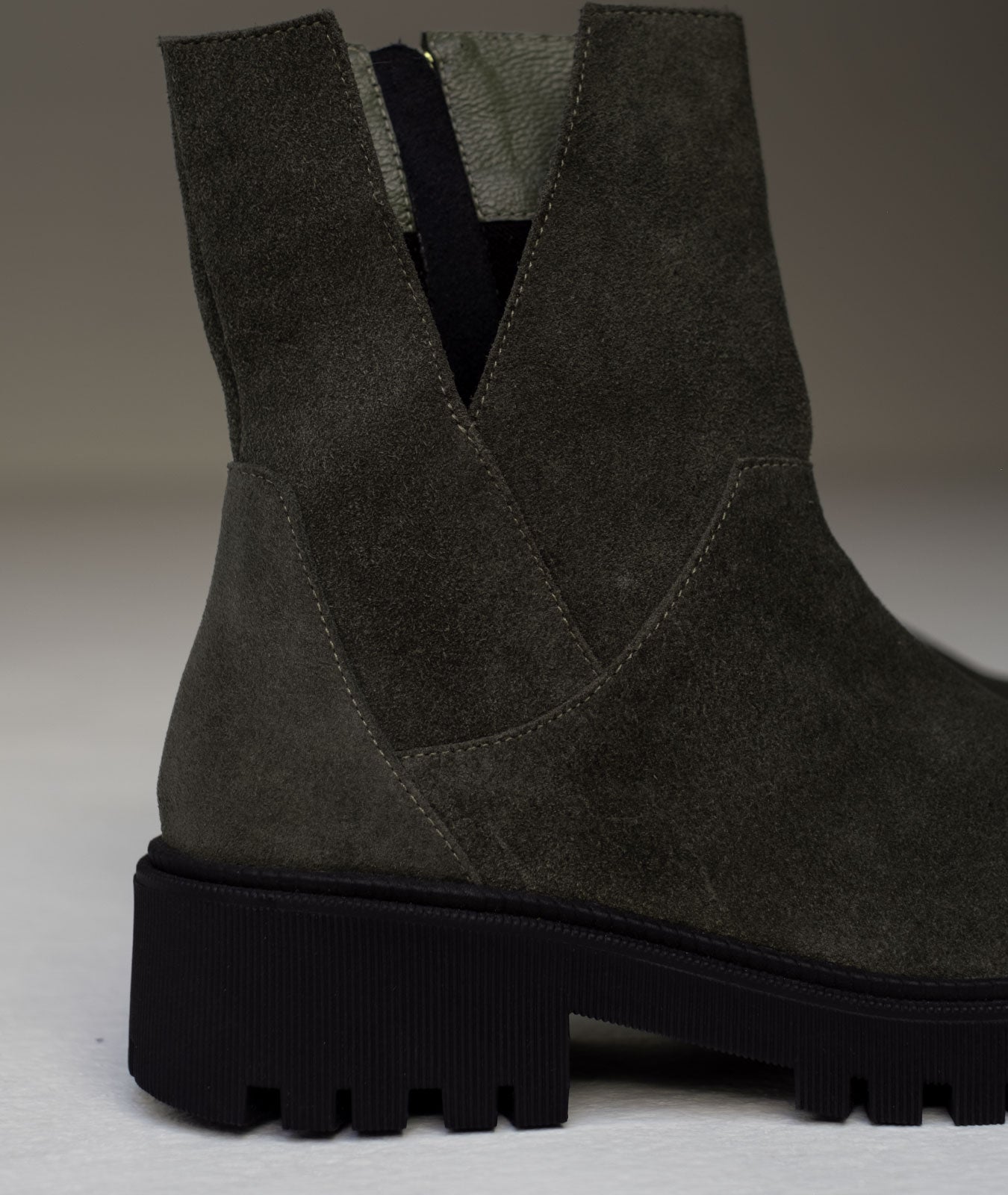 Botín Cyra Verde: botines de cuero tipo Chelsea hechos a mano. Color verde musgo, suela antideslizante, livianos y cómodos. Perfectos para looks urbanos o climas frescos.