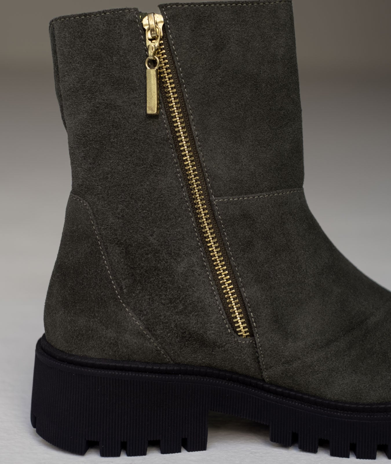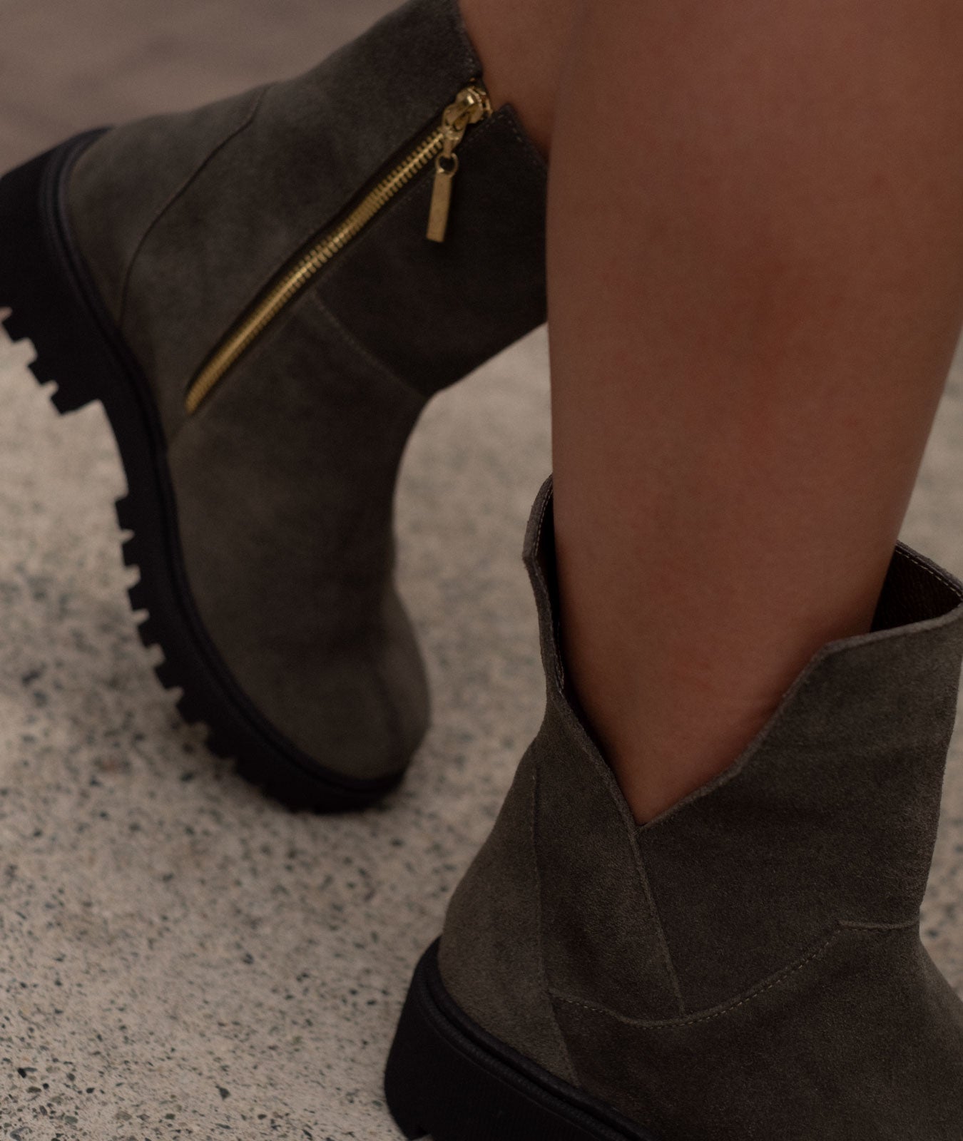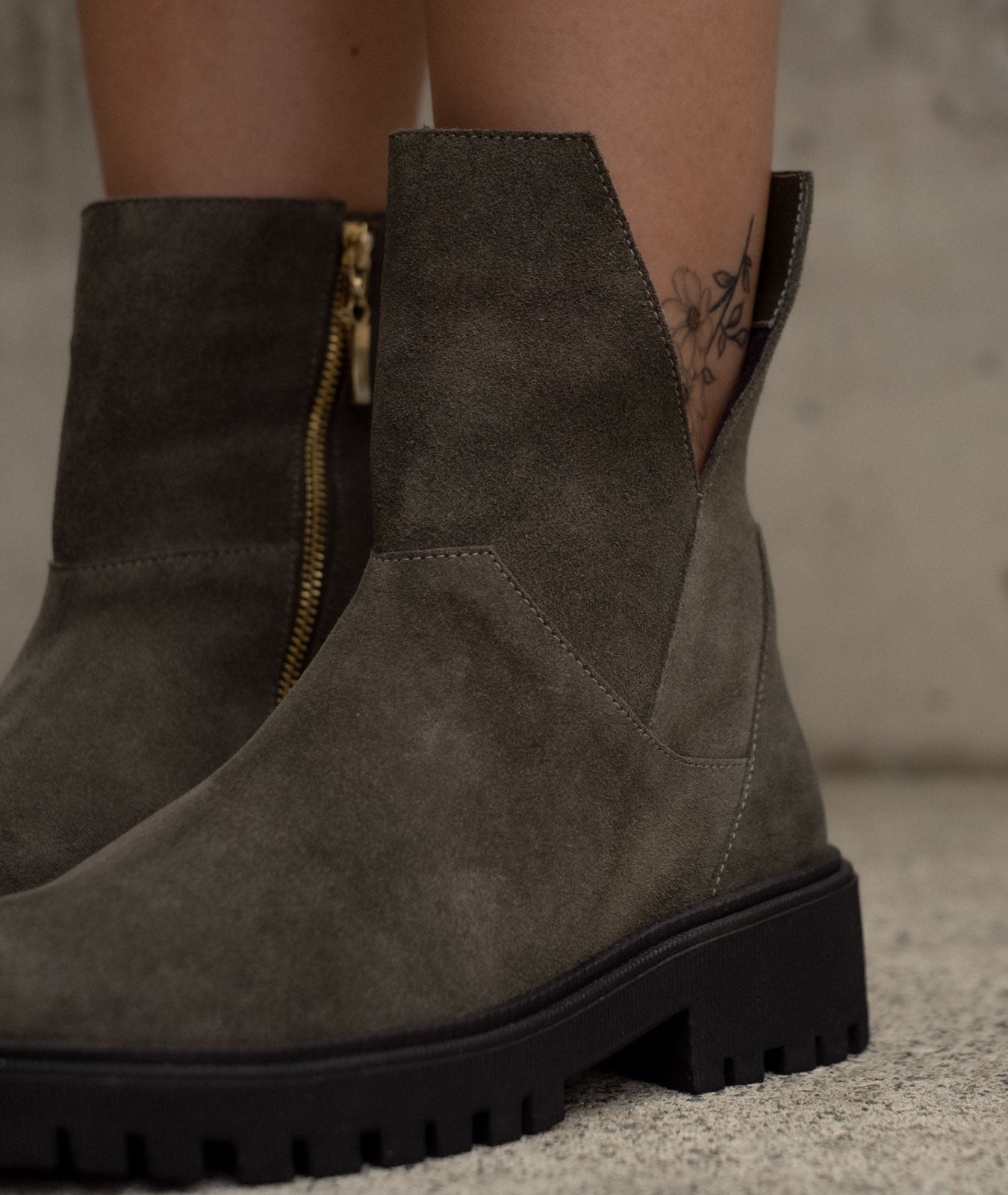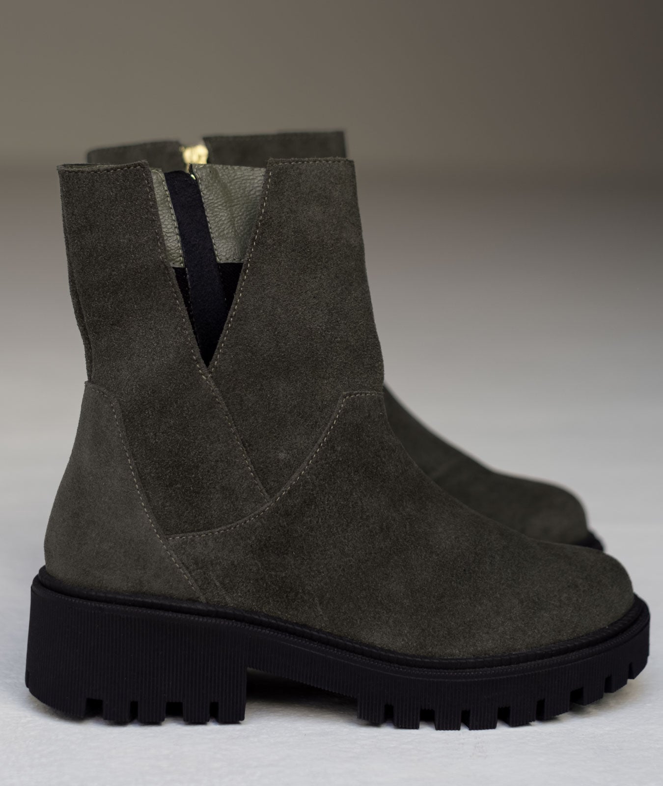 Botín Cyra Verde: botines de cuero tipo Chelsea hechos a mano. Color verde musgo, suela antideslizante, livianos y cómodos. Perfectos para looks urbanos o climas frescos.