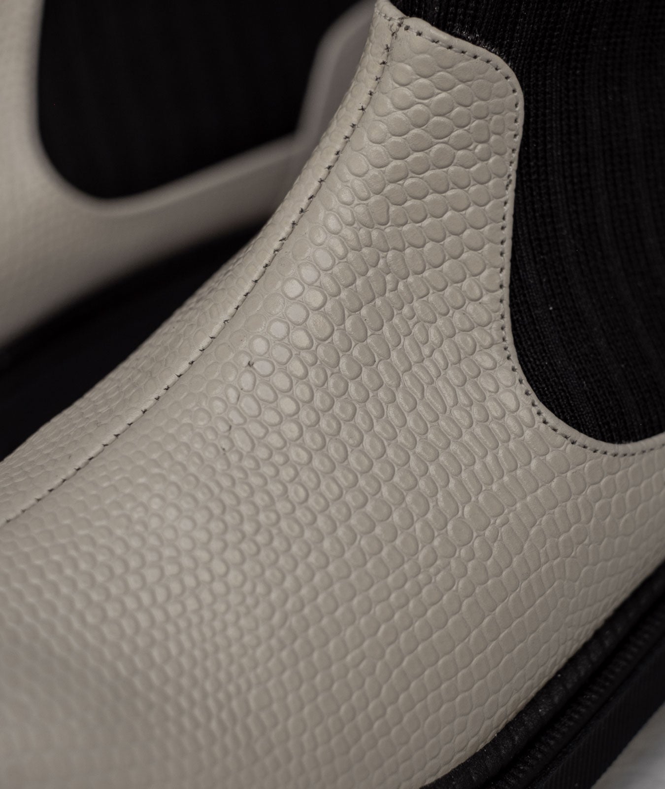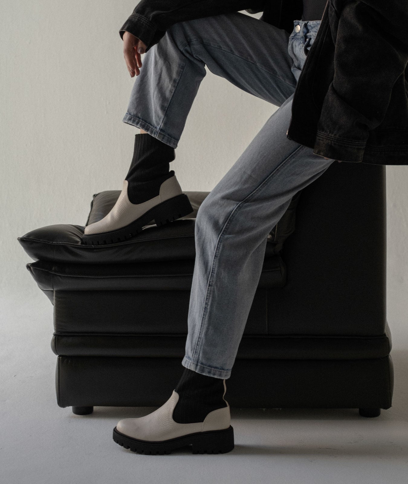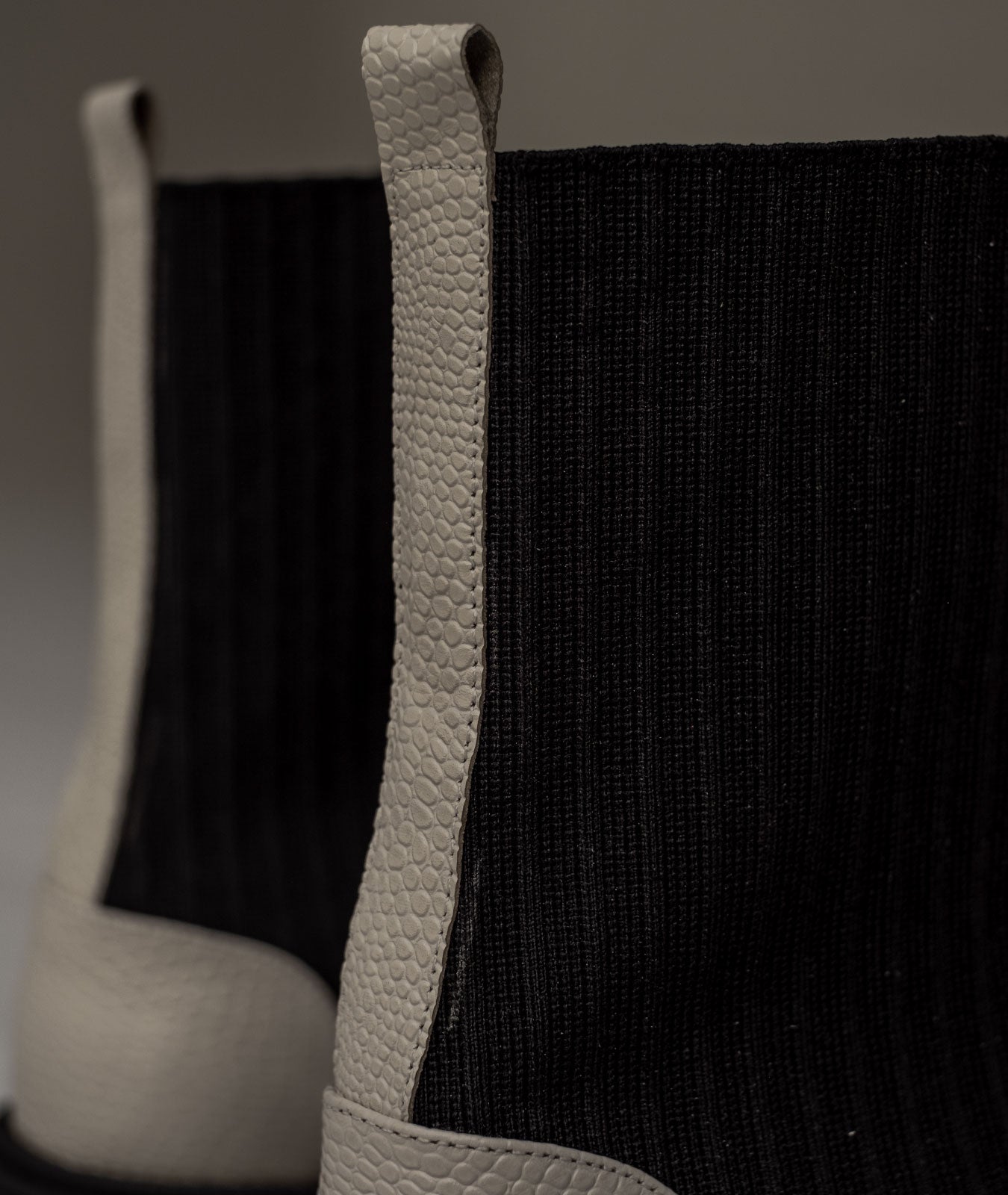 Botín tipo sock boot en cuero blanco y negro, con ajuste cómodo, plantilla acolchada y suela TR antideslizante. Liviano, versátil y hecho artesanalmente en Colombia