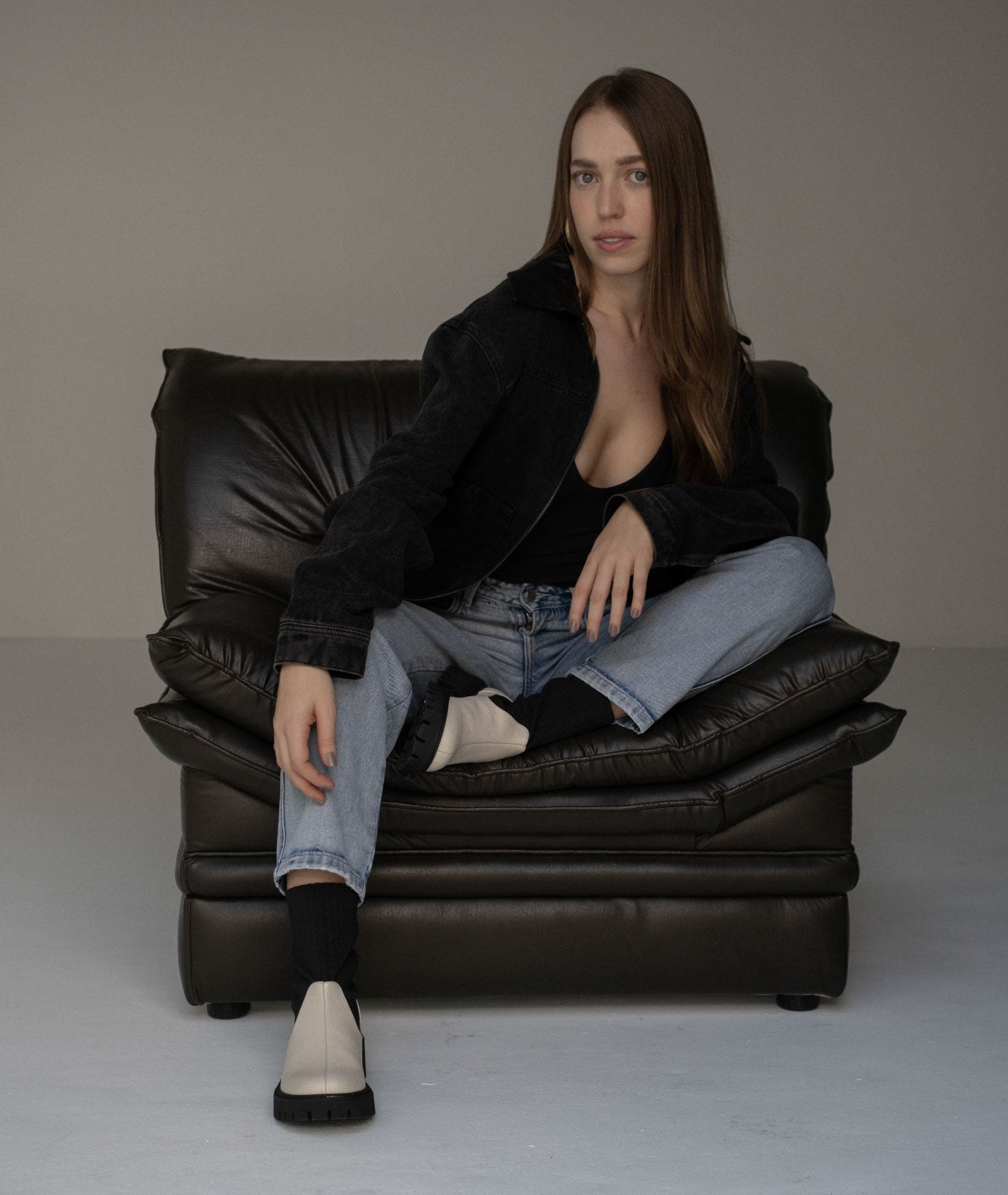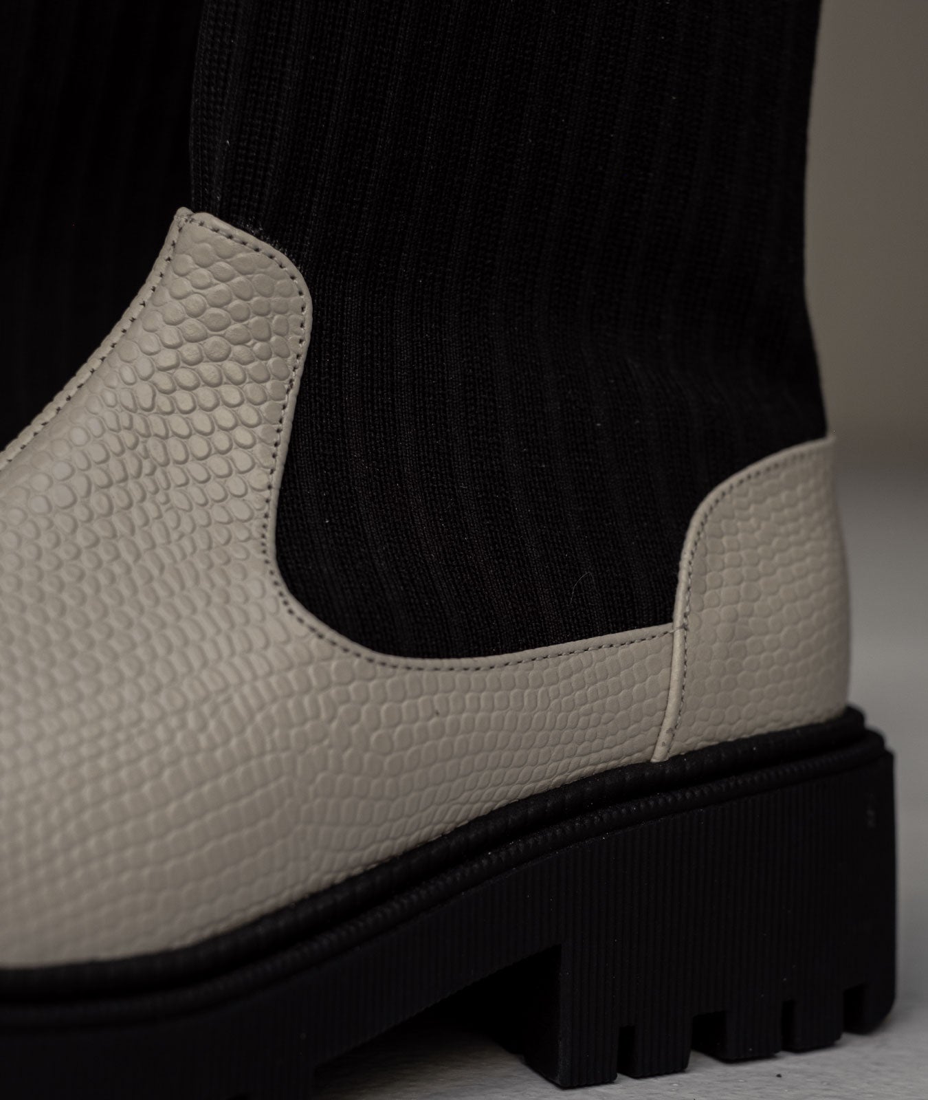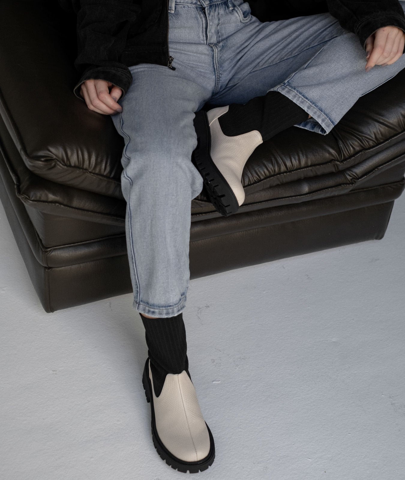 Botín tipo sock boot en cuero blanco y negro, con ajuste cómodo, plantilla acolchada y suela TR antideslizante. Liviano, versátil y hecho artesanalmente en Colombia