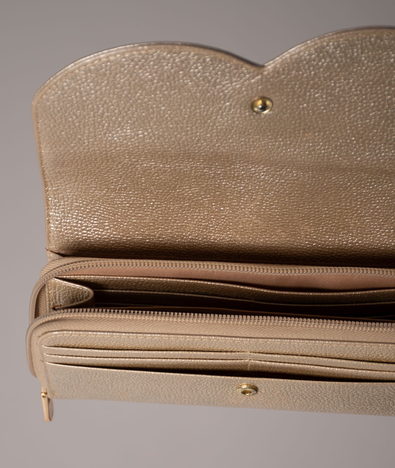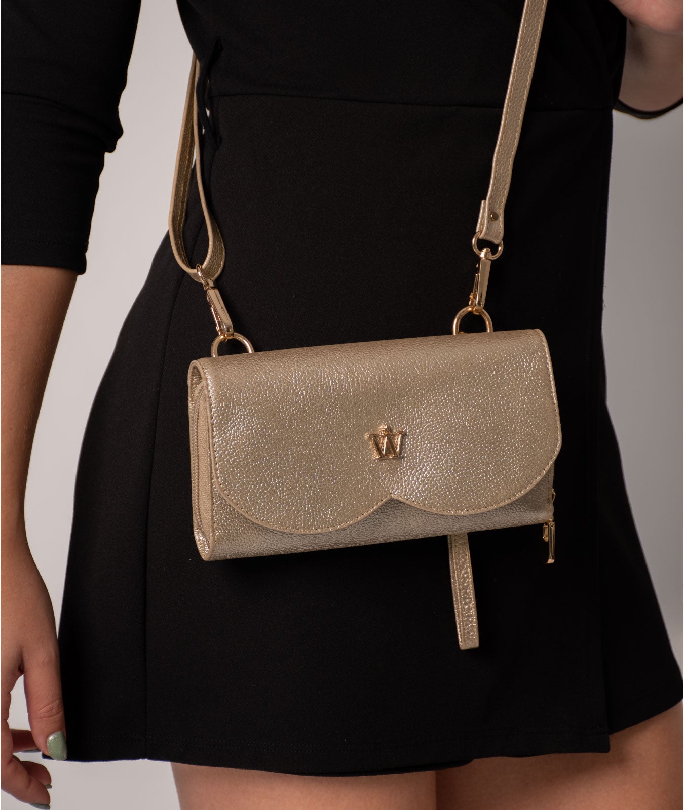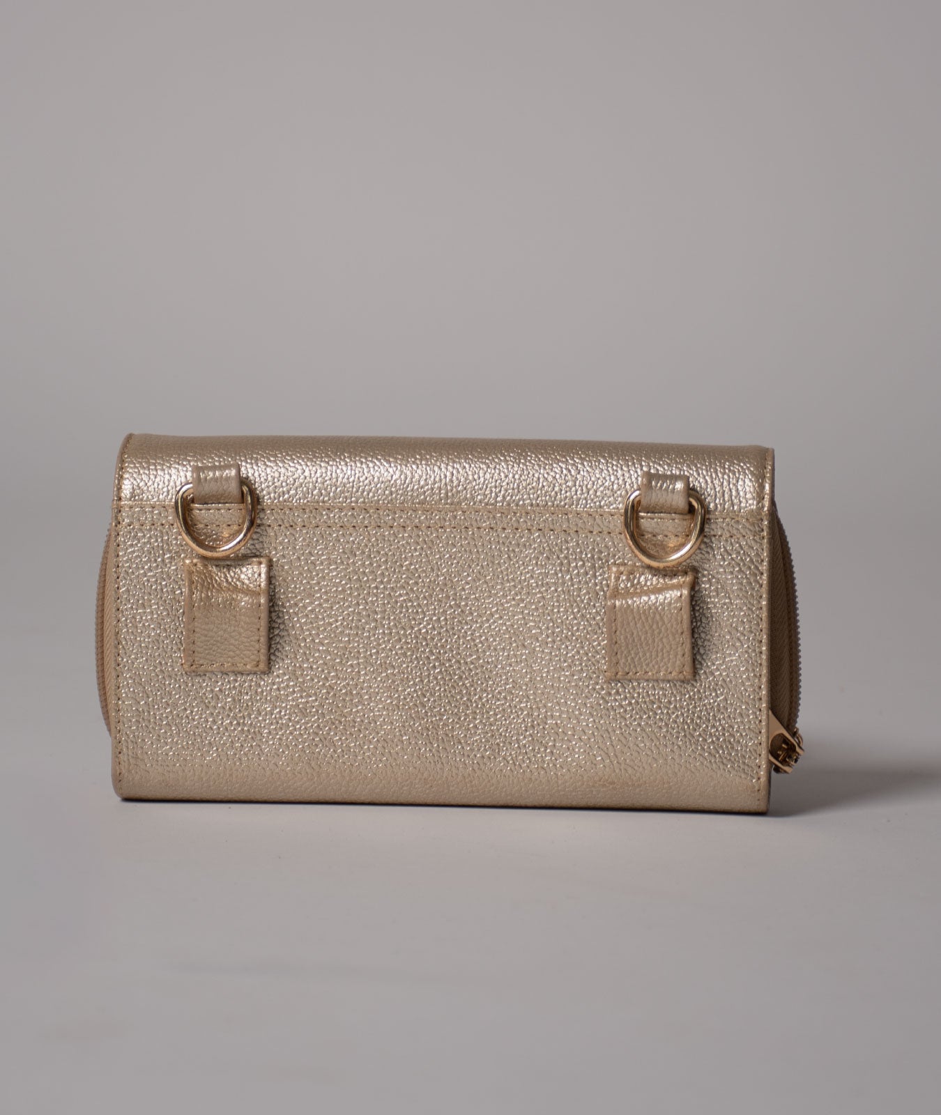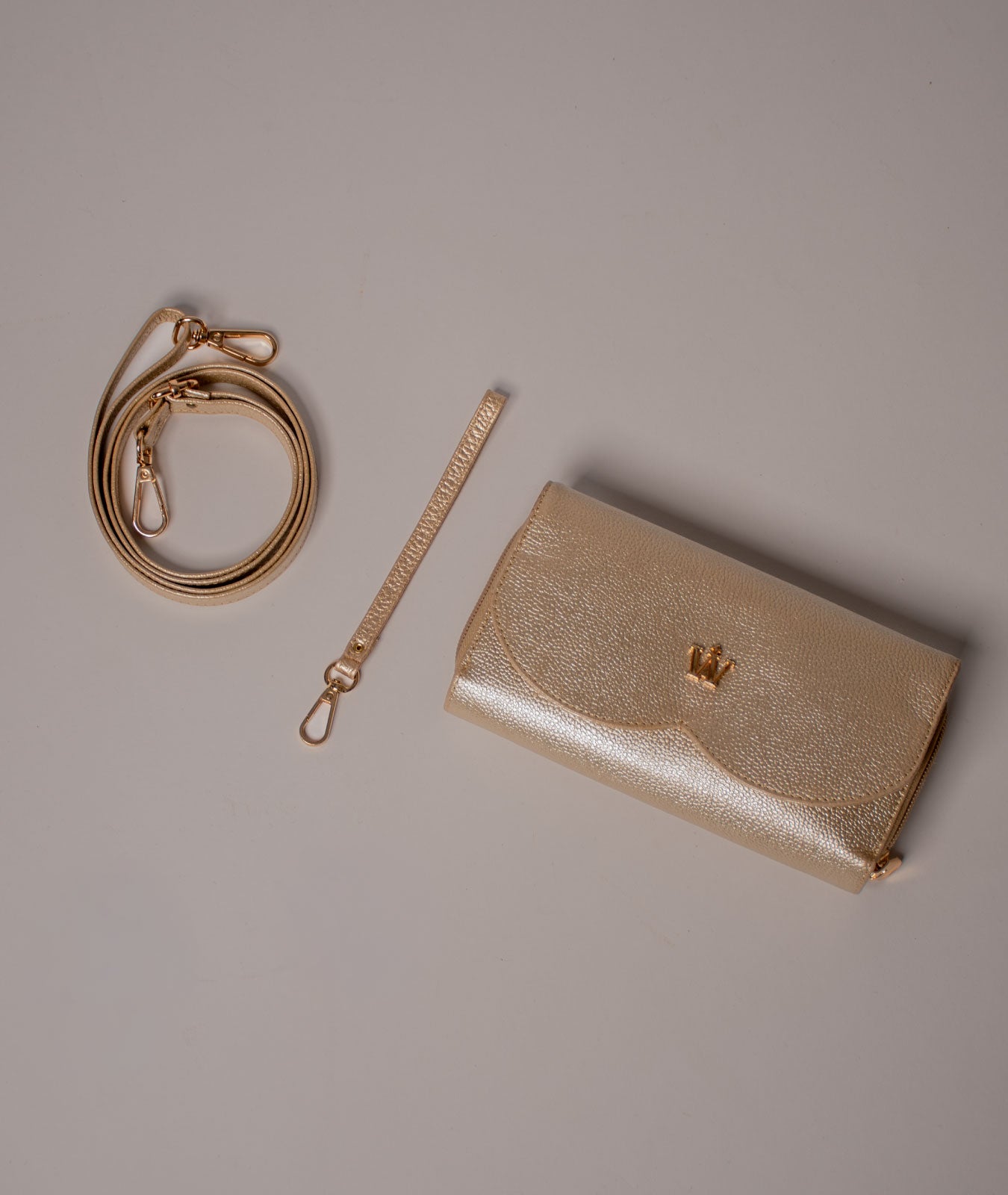 Gaia Oro: porta celular en cuero dorado, elegante, ligero y funcional. Ideal para uso diario con estilo.
